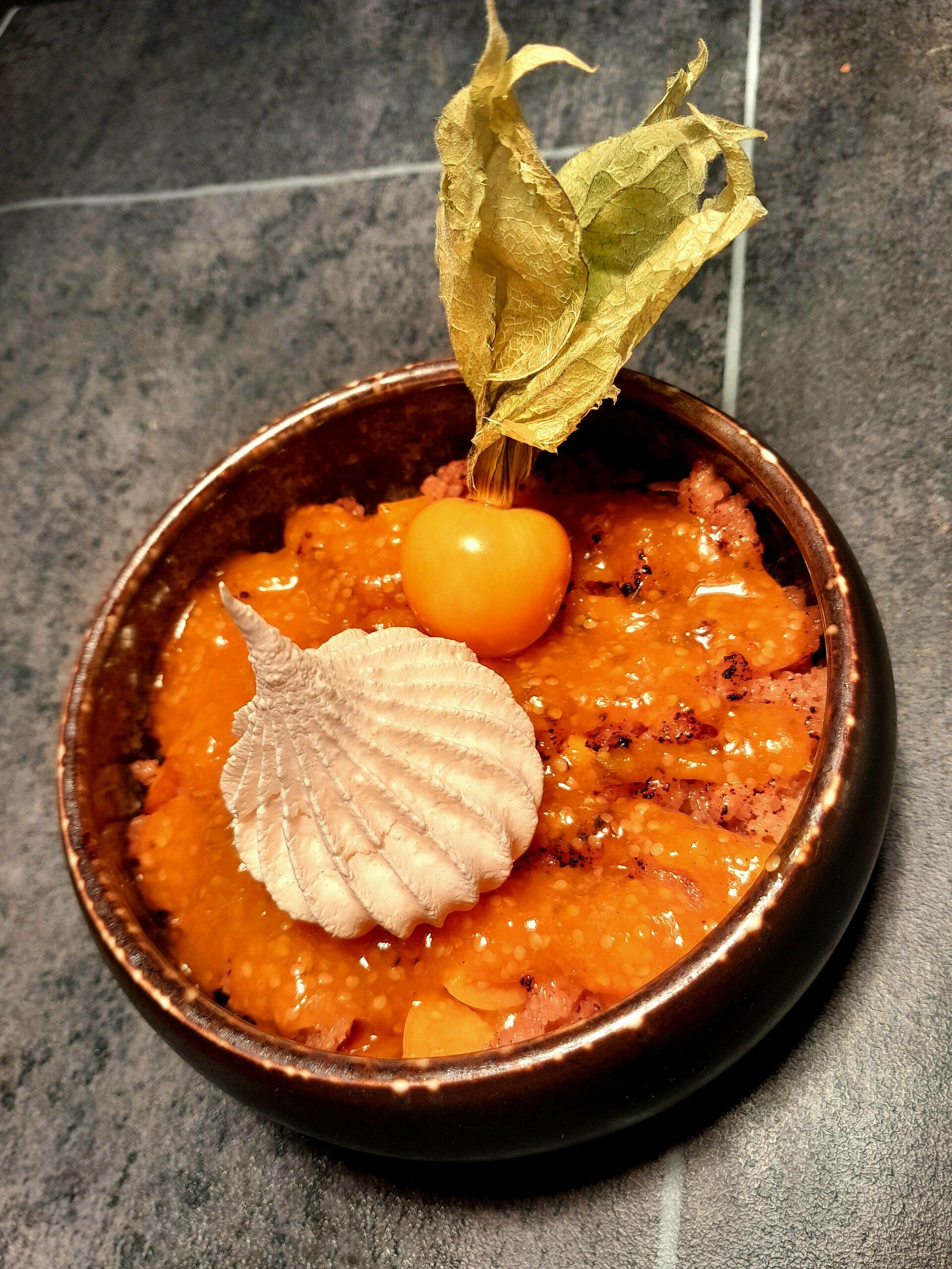 Physalis Crue et Rôtie, Crumble, Coulis de Physalis, Meringue